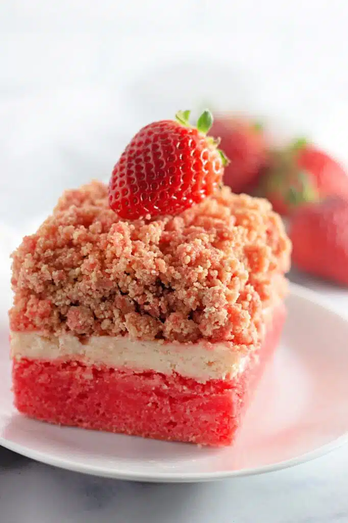 Growing up, my family always had a love for strawberries. Whether it was picking fresh berries at a local farm or just simply enjoying them with whipped cream, strawberries symbolized togetherness and joy. We still take our kids to a local strawberry farm each year to purchase fresh berries. I decided to recreate one of my husband’s favorite strawberry desserts: strawberry crunch bars with these Easy Strawberry Crunch Cake Bars made with Box Cake Mix. The idea was to take a simple cake mix and elevate it with a creamy frosting and a delightfully crisp topping.