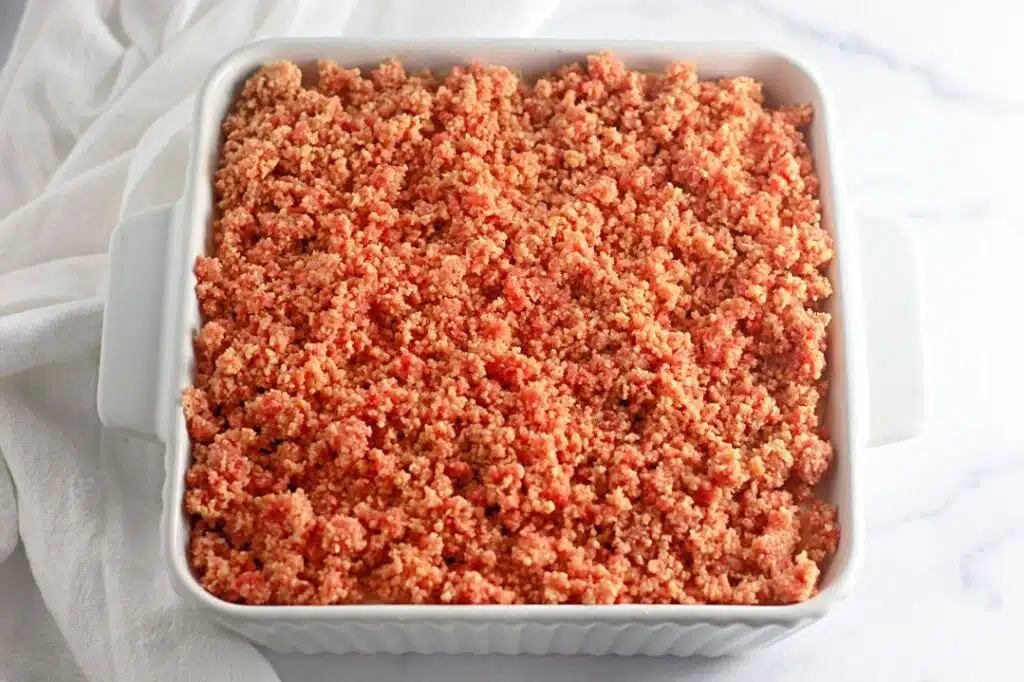 - Strawberry gelatin powder – Gives the topping its signature pink color and fruity kick. This ensures the crunch topping has a bold strawberry essence.