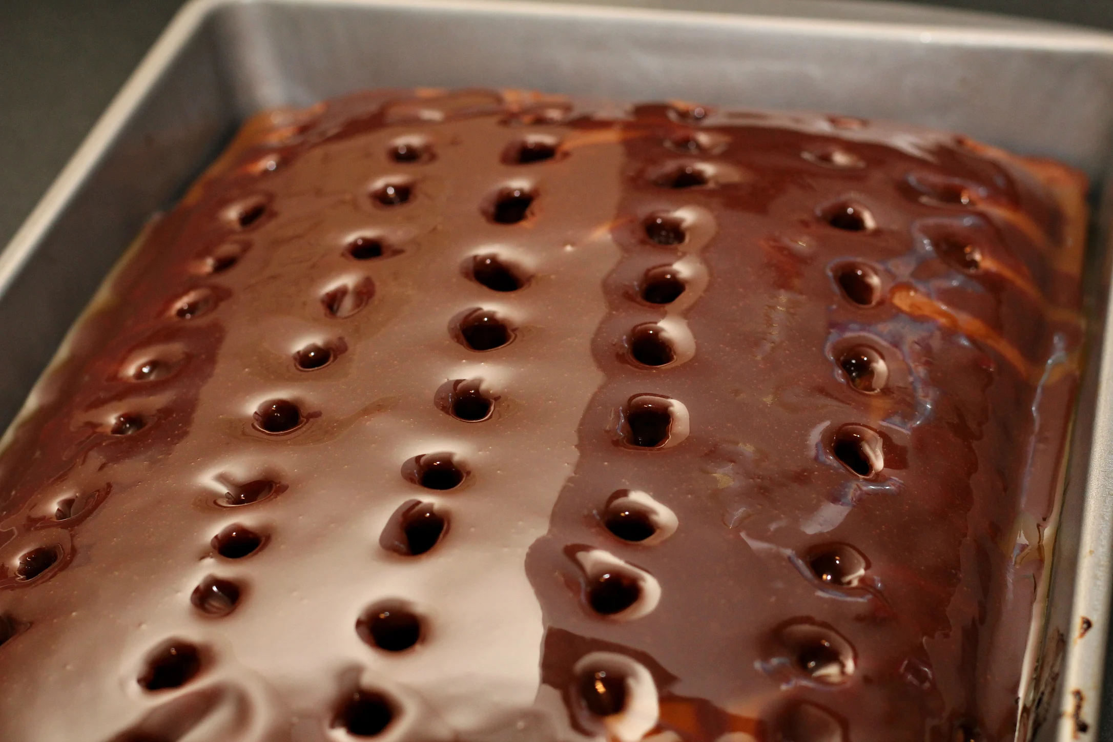 - Now it’s time for the filling! Pour half of the chocolate caramel mixture over the top of the cake, making sure to evenly distribute it over the holes. Allow the cake to sit for a few minutes so that it can absorb the filling.